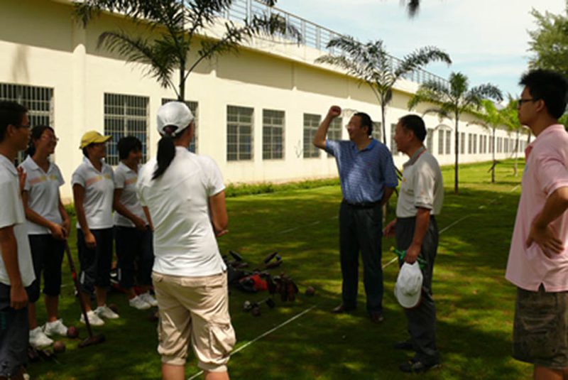 木球是海大的特色运动项目,已有十几年的发展历程,公司木球队在历年国内、国际赛事中,一直保持国内领先水平。今年7月公司木球队在山东举行的两个全国木球赛中取得了院校组男、女团体第一名和4项个人第一名,受到国家体育总局的商请,即将于今年12月代表国家赴阿曼马斯喀特参加第二届亚洲沙滩运动会。8月29日上午,公司党委刘康德书记和傅国华副董事长亲临公司“金桥”木球场现场,为即将代表国家出征的海大木球队加油、鼓劲,并与木球队员一起体验木球运动。