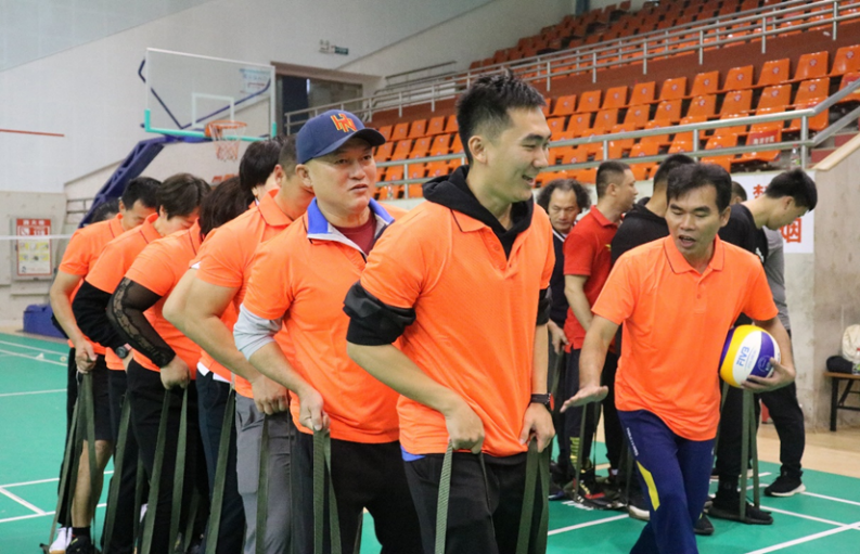 “有轨电车”环节中,整队的重量全部落在两条履带,但依旧阻挡不了教职工前进的步伐。队员们齐心协力、运用巧劲,动作一致、合作冲向终点。