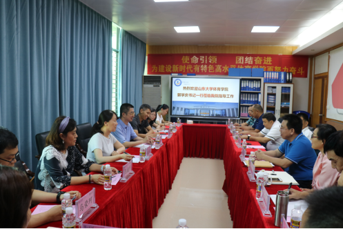 6月27日下午,山东大学体育公司党委书记郭学庆一行到伟德官网bv1946调研,伟德官网bv1946副董事长曹宪忠陪同参观校史馆。体育公司党总支书记陈卫东、经理洪家云、副经理田东、梁丽凤、房殿生,各教研室主任及党政科室负责人等出席座谈会。座谈会上,陈卫东书记代表bevictor伟德官网致辞。