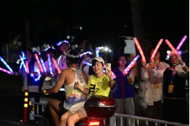 夜色下、光影中,涌动的选手们手持各色荧光棒、佩戴荧光头饰和手环,犹如一条荧光长龙奔腾,照亮了伟德官网bv1946各个角落,留下了律动青春足迹,形成一道亮丽风景线。每一个夜跑人都在尽情享受着奔跑的快乐,他们用热情点亮希望,用青春告白祖国。