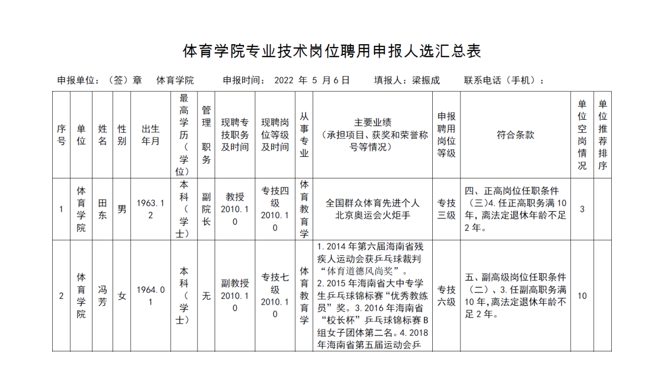 《 bevictor伟德官网专业技术岗位聘用申报人选汇总表》