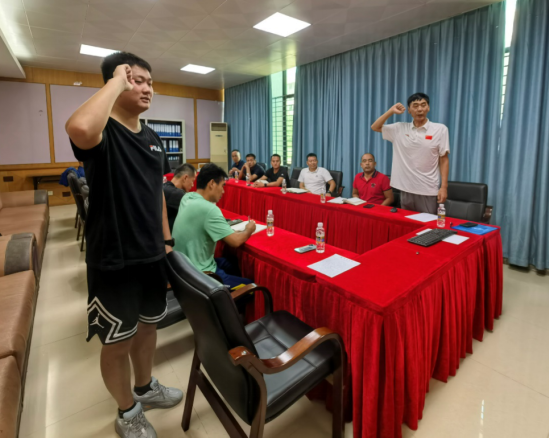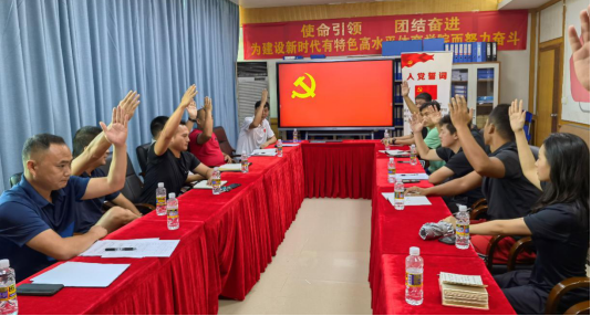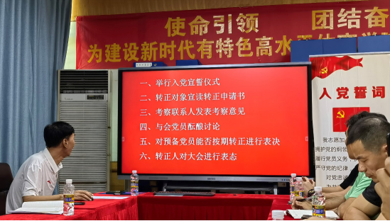 会议第一项,讨论、投票、表决杜金同志由预备党员转为正式党员的决议。按照“举行入党宣誓仪式、转正对象宣读转正申请、考察联系人发表考察意见、与会党员酝酿讨论、对预备党员能否按期转正进行表决、转正人对大会进行表态”六个步骤进行。首先由第三支部书记肖国良同志带领杜金同志进行庄严的入党宣誓仪式;接着杜金同志郑重宣读转正申请;考察联系人高子岩及彭祚琼两位同志就杜金一年来的工作、生活等情况发表考察意见;第三支部副书记吴钟权、经理洪家云、副经理房殿生几位同志肯定了杜金一年来的工作表现、鼓励其再接再厉、积极践行;最后与会的全体党员一致举手表决通过杜金同志由预备党员转为正式党员的申请。